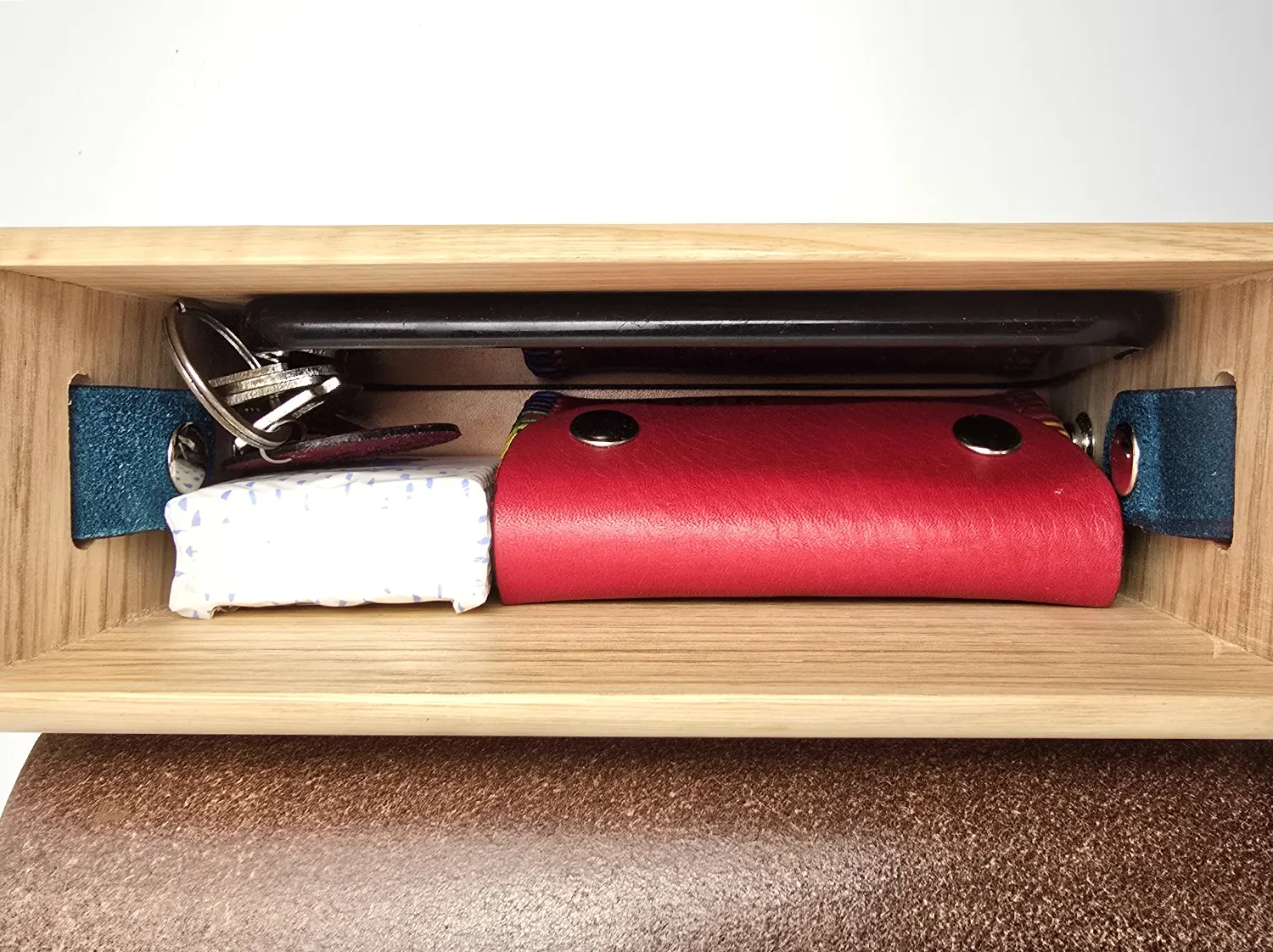 - Tapa y cinta: cuero vacuno de curtición vegetal (subproducto de la industria cárnica), curtido sin químicos agresivos. Conserva las marcas naturales de la piel: pequeñas arrugas, marcas o cicatrices que le dan carácter y hacen que no haya dos iguales. Con el tiempo, el cuero desarrolla una pátina natural que lo hace aún más bello y único.